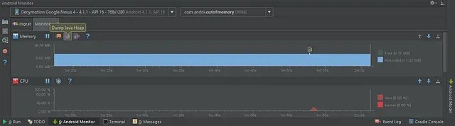 Untuk melihat penggunaan memory, buka window Android Monitor (alt-6) lalu pilih tab Monitors. Akan tampil grafik Memory, CPU, Network dan GPU. Grafik memory akan menampilkan jumlah memory yang digunakan saat aplikasi sedang dijalankan. Pengambilan data HPROF dilakukan dengan menggunakan tombol Dump Java Heap.